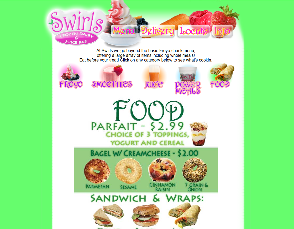 This website is actually for a place I used to work - Swirls Frozen Yogurt in downtown San Jose. It was a really fun laid back job. When the management changed, I offered to make a new site for the store and my boss agreed to let me give it a make over.