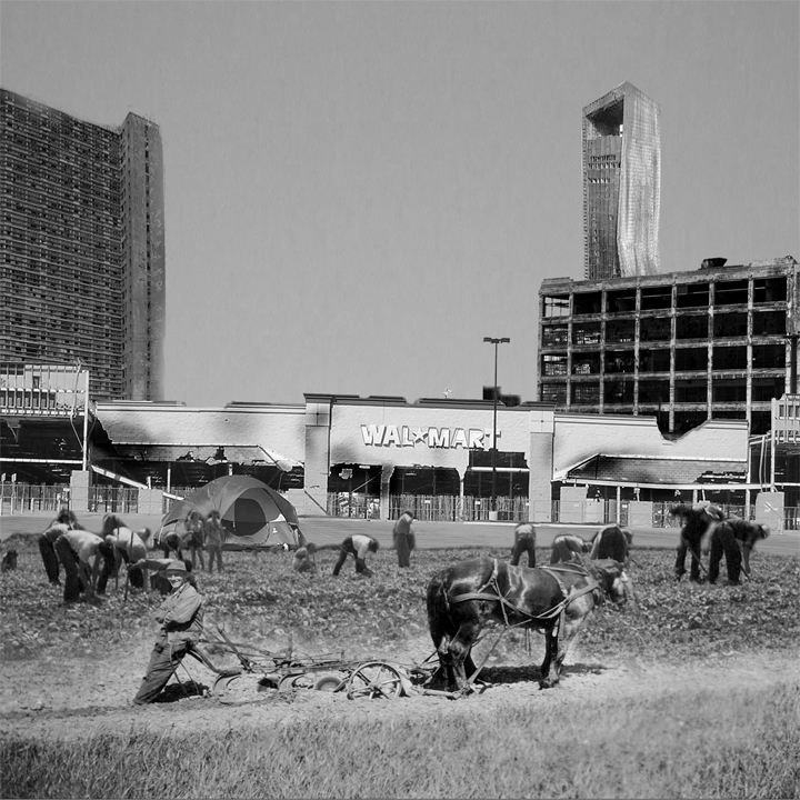 After WWII and into the 1950's our economy was booming and suburban sprawl covered the nation. We had discovered Texas oil and the whole world had a seemingly unlimited supply of oil. We were swimming in oil and looking for new ways and technologies to apply it. As years passed and science improved, we be came very adept at making oil based products, from plastics to pesticides, let alone raw automobile fuel. However, we've now reached peak oil, and the world has a global economy closer to Globalization than ever before in history. But our entire economy is based around oil and it's running thin. Our bubble is about to burst. Because we have no viable solutions for the replacement of oil, the future will be drastically different. No more Walmart's importing cheap-labored goods from across the planet. No trucking routs or rush hour traffic. No more big business. No groceries stores with packaged products. Our most notable change will be the localization of agriculture and reclaiming suburban land. These pictures represent our past, present and future relationship with oil.
