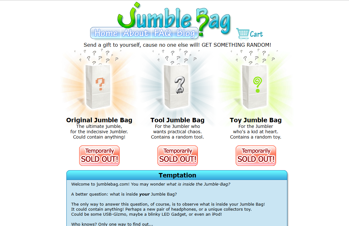 This is a fun story you'll wanna read... woot.com is known for it's "bag of crap," which was a mystery-surprise bag. woot.com usually sells cool stuff, but occasionally they end up with junk they cant sell - either because it's left over, defective, a returned, or whatever. After enough of this junk pools up they do a special sell called the woot bag of crap. Usually these sell out instantly. The idea is pretty tantalizing - for just a few bucks and free shipping you can have your very own mystery bag of crap! I was a little disappointed that I always missed out on my chance to grab one. Then I realized: these are popular. What if I made a website that only sells random bags? After a few weeks of marinating on the idea I came up with jumblebag.com. There would be three flavors: