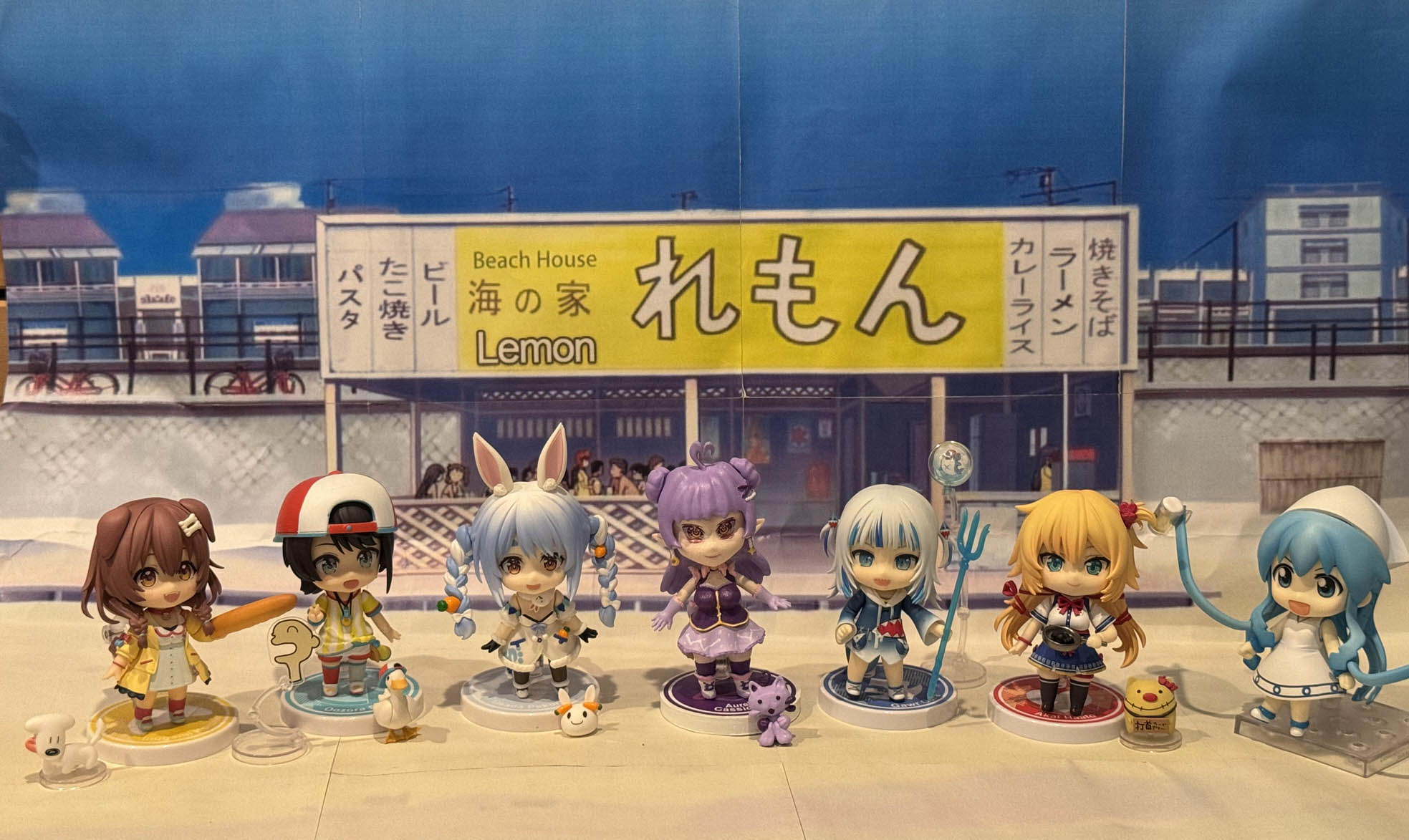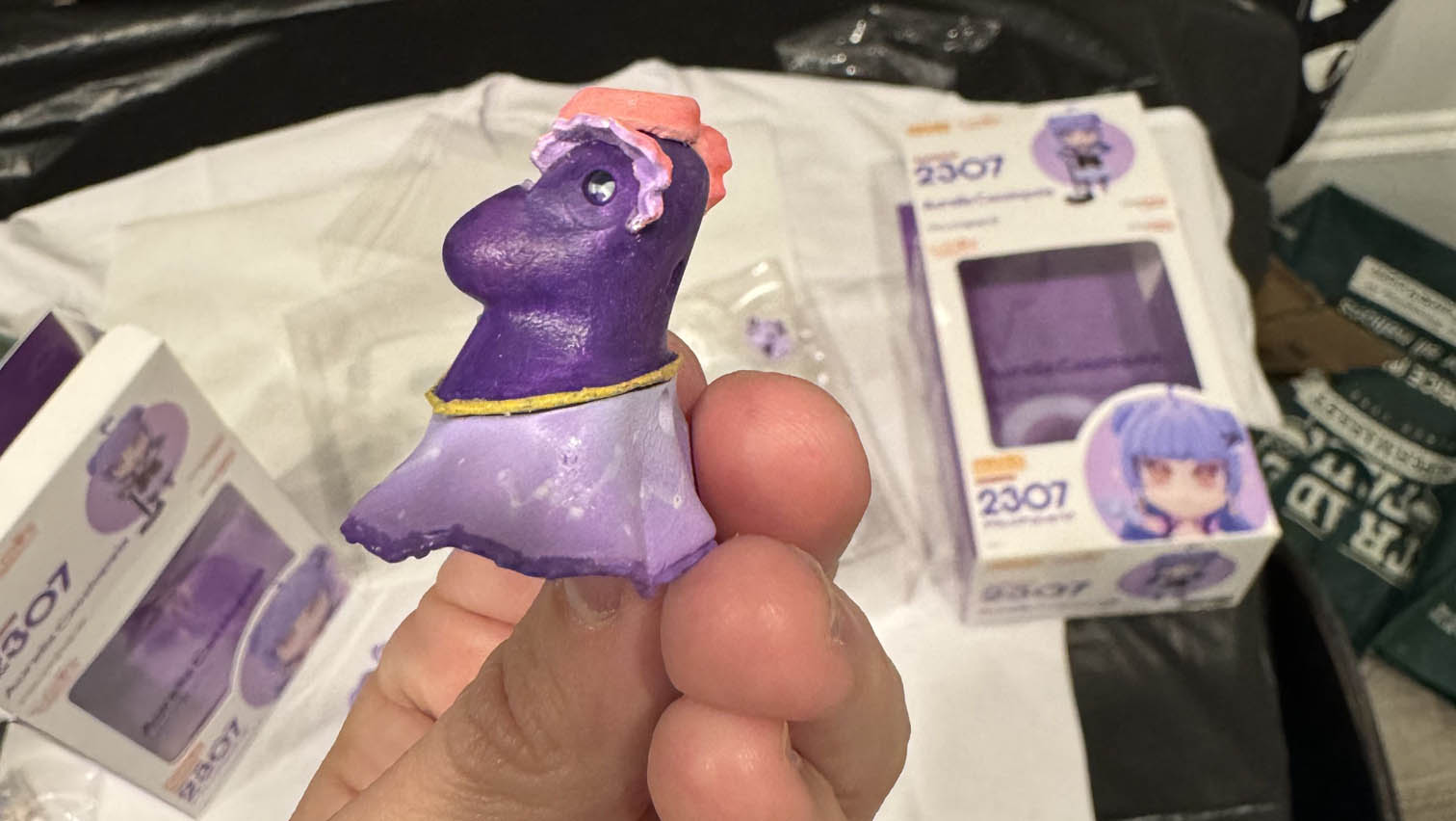 In the above picture you you can see the the bottom row are the two Nendoroids I made for Aurelia, the one on the left was the original I made for the video, and the one on the right was my second take after I had learned airbrushing. It came out much better, and I plan on making more bootleg Nendoroids in the future. Below are some pictures of the Nendoroid posed with the real ones.