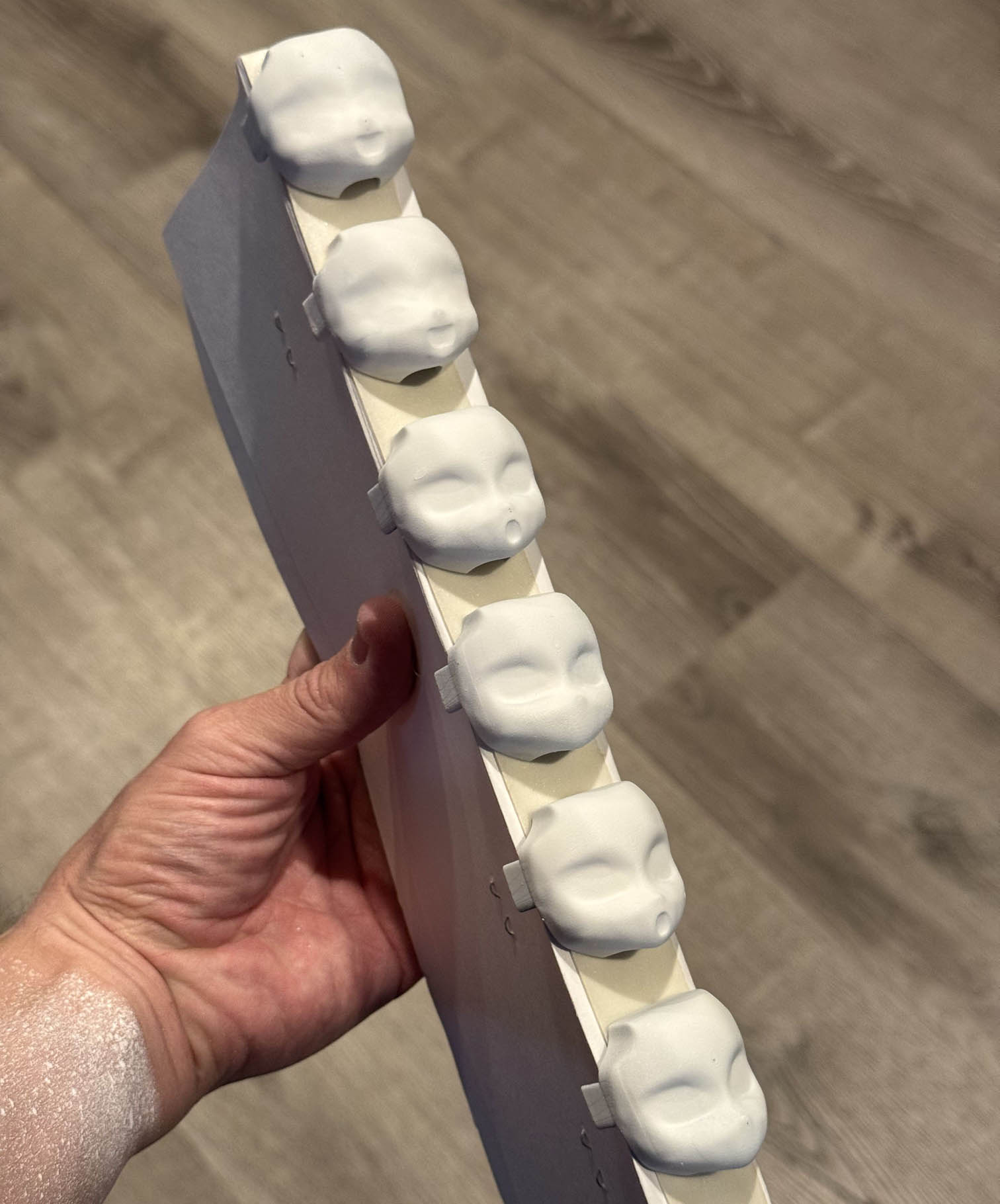 This time I had to be more methodical in my work flow. I had already made one Nendoroid, which I planned on keeping, but now I wanted to make 3 more: 2 Fuwa and 1 Reli. So for the next week or so my Queens apartment became a Nendroid factory. I started off by printing all the pieces I would need and then giving them a primer coat. For the many face-plates I needed, I made a little cardboard jig to be able to paint them more easily.