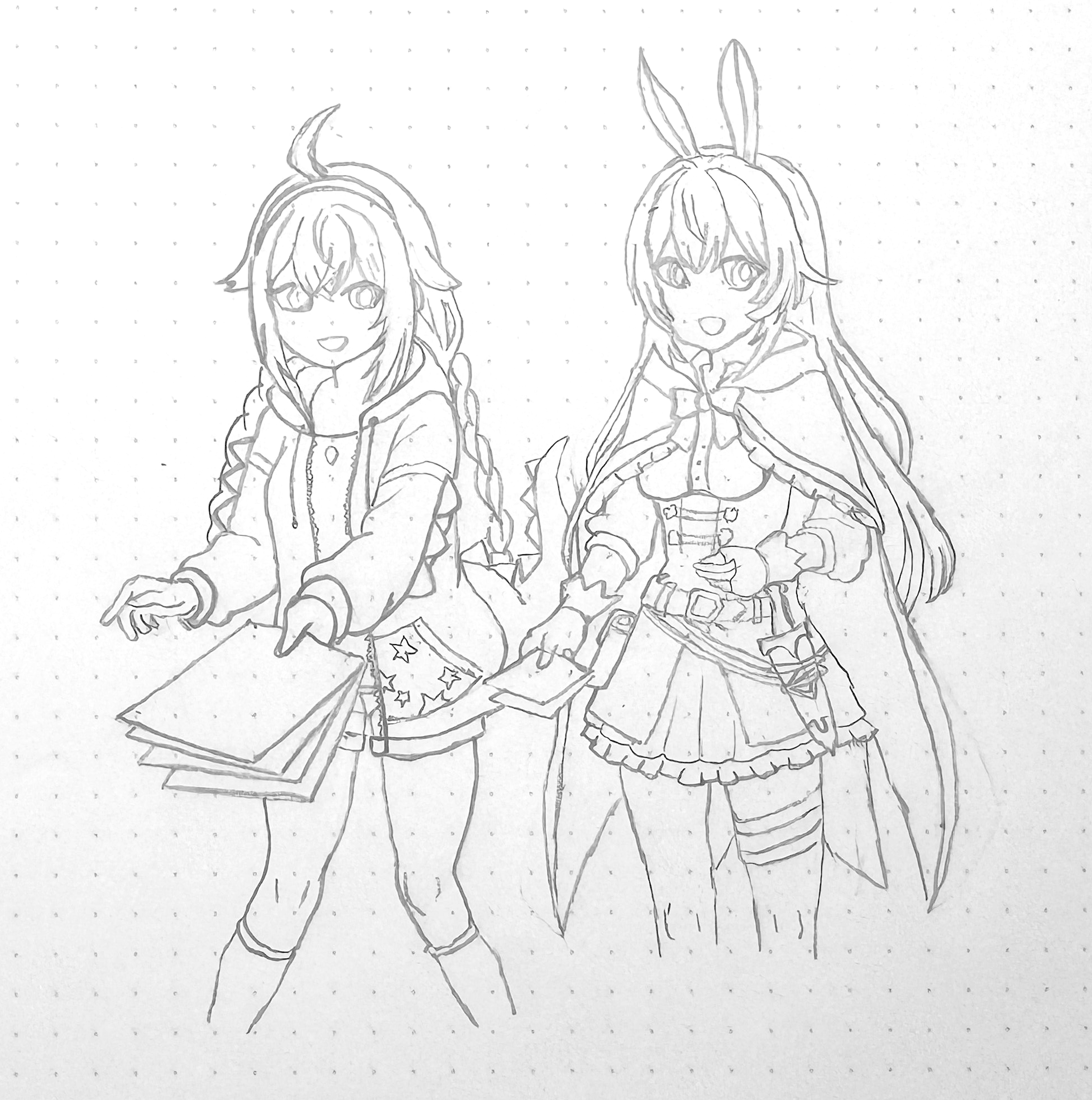 I started with a doodle on paper by referencing the characters as well as some stock art to get the pose sorta okay. My initial drawing was pretty scuffed, but I had no time, so had to roll with it.