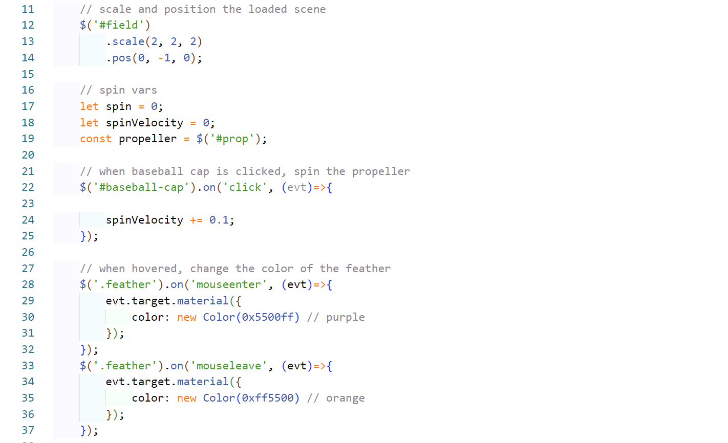 So I decided to add an event layer - if ThreeQuery has access to your ThreeJS scene object, it can find your canvas and camera, and automatically set up raycasting. The you can add standard mouse events to 3D objects with the .on('mousedown') syntax. Take a look at the screenshot below: